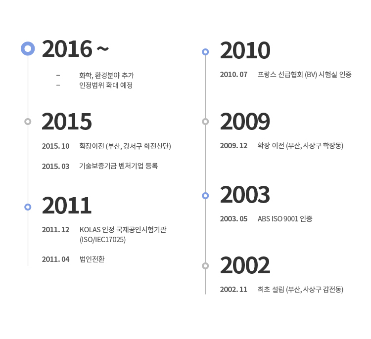 - 2002년 시험편 가공 및 기계적 시험으로 시작하여 현재까지 많은 변화와 발전을 이루어 왔습니다.